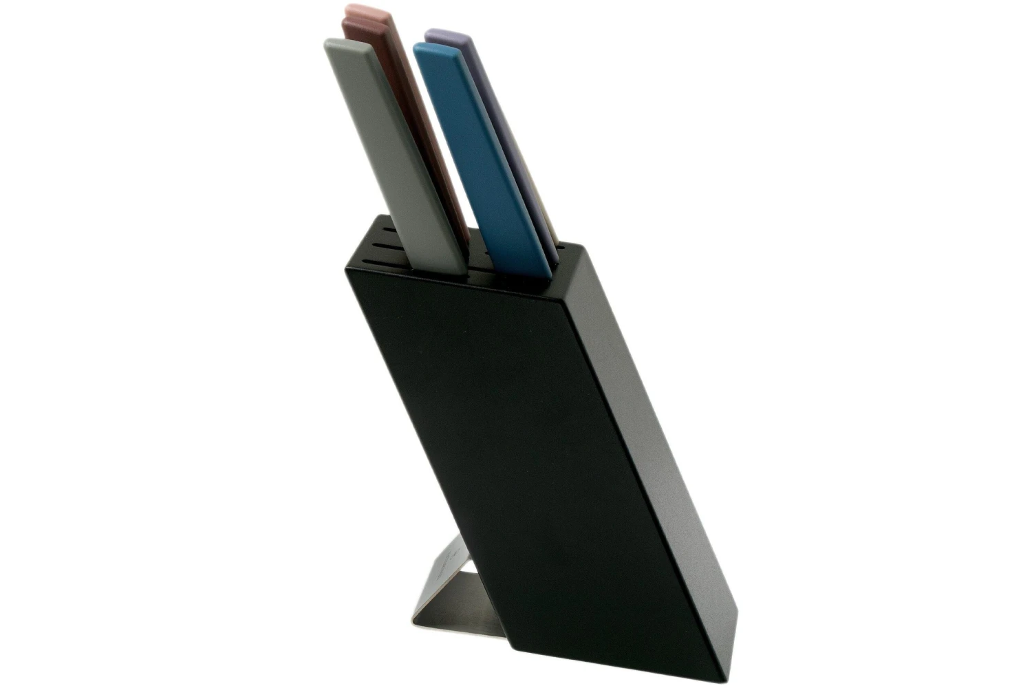 Le bloc de 6 couteaux de cuisine Victorinox Swiss Modern est un pratique et élégant et convient à toutes les cuisines. Fabriqué en bois de hêtre laqué noir, ce bloc est très moderne. Les manches de couteaux de différentes couleurs apportent une touche de fraîcheur à tout plan de travail. Le fameux logo Victorinox est gravé sur le pied en métal.